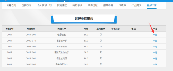 操作步骤:培养---重修申请---点击课程后的申请按钮即可完成该门课程的重修申请。