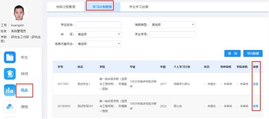 导师审核步骤:登录系统后,点击“培养”-“学习计划管理”,查看学生选择的课程,符合要求的,通过审核。