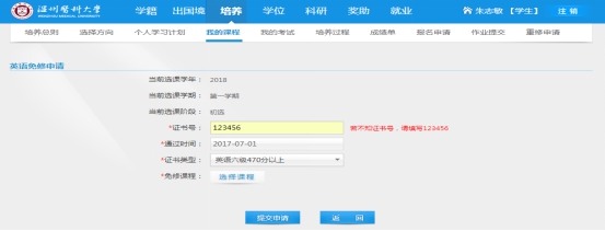 (三)操作方法:点击培养-我的课程-外语免修-填写信息、上传证明文件附件-提交申请。