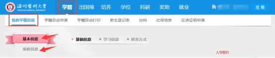2. 登录成功后,点击“学籍-我的学籍信息-基本信息”及“家庭信息”,核对并修改相关信息。