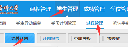 导师登录系统后,进入学生管理——过程管理——培养计划,可查询学生填写的培养方案并进行审核,导师也可驳回学生的培养计划,经学生修改后再次提交审核。导师审核通过后方可进入学院审核阶段。