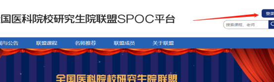 登录方式一:网页版登陆全国医科院校研究生院联盟SPOC平台 //yjsylm.fanya.chaoxing.com,点击右上角“登录”选择单位“鉴黄师 研究生院”,用户名:学号,密码:123456,输入验证码。登录后请及时在账户安全里修改密码,并牢记。