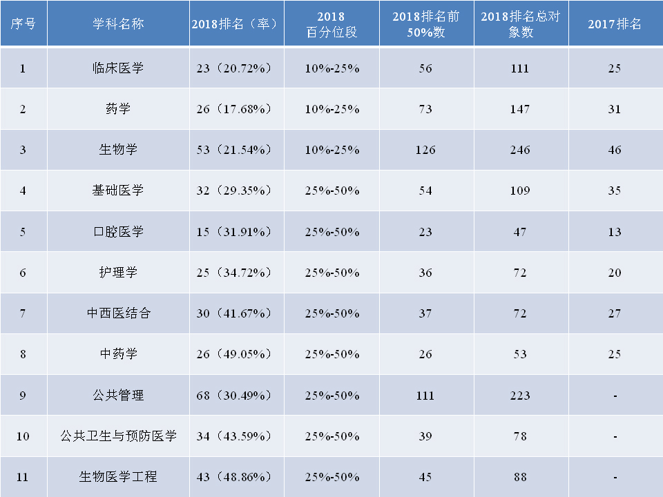 本次发布的排名榜单包括93个一级学科,共有460所高校的4999个学科点上榜。本次榜单中,我校临床医学、药学、生物学等3个学科位于全国同类学科排名10%-25%区间,临床医学学科位列第23,排名较上一年度上升2名,药学学科排名位列第26,较上一年度上升5名。基础医学、口腔医学、护理学、中西医结合、中药学、公共管理、公共卫生与预防医学、生物医学工程等9个学科位于全国同类学科排名25%-50%区间,其中基础医学学科排名较上一年度上升3位,排名位列第32位,进入前30%;公共管理、公共卫生与预防医学、生物医学工程为本年度首次上榜学科。
