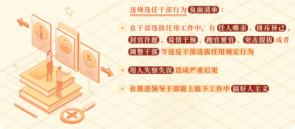 “违反干部选拔任用工作规定”的行为表现,主要是指违反《党政领导干部选拔任用工作条例》《关于防止干部“带病提拔”的意见》《干部选拔任用工作监督检查和责任追究办法》等规定。从近年来查处的严重违纪违法案件看,有的凭个人亲疏、个人好恶来选人用人,把职务作为私相授受的个人资源;有的依然相信“不跑不送、原地不动”“又跑又送、提拔重用”那一套,变着法子拉关系、走门子;有的领导班子主要负责人已经明确即将离任,还突击提拔、调整干部等。