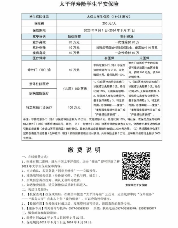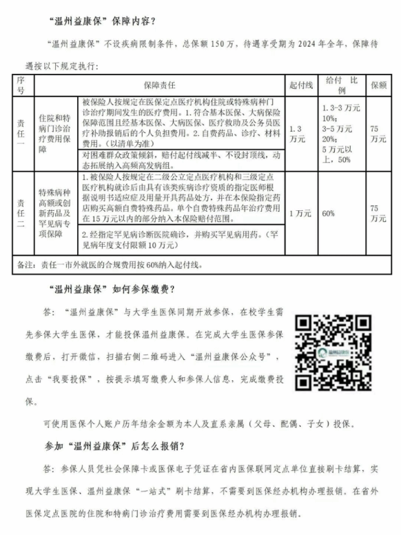 可在投保以上大学生医疗保险的基础上,自愿选择参保温州益康保等作为补充。具体内容可通过以下二维码查看保险方案后和自愿选择是否投保。