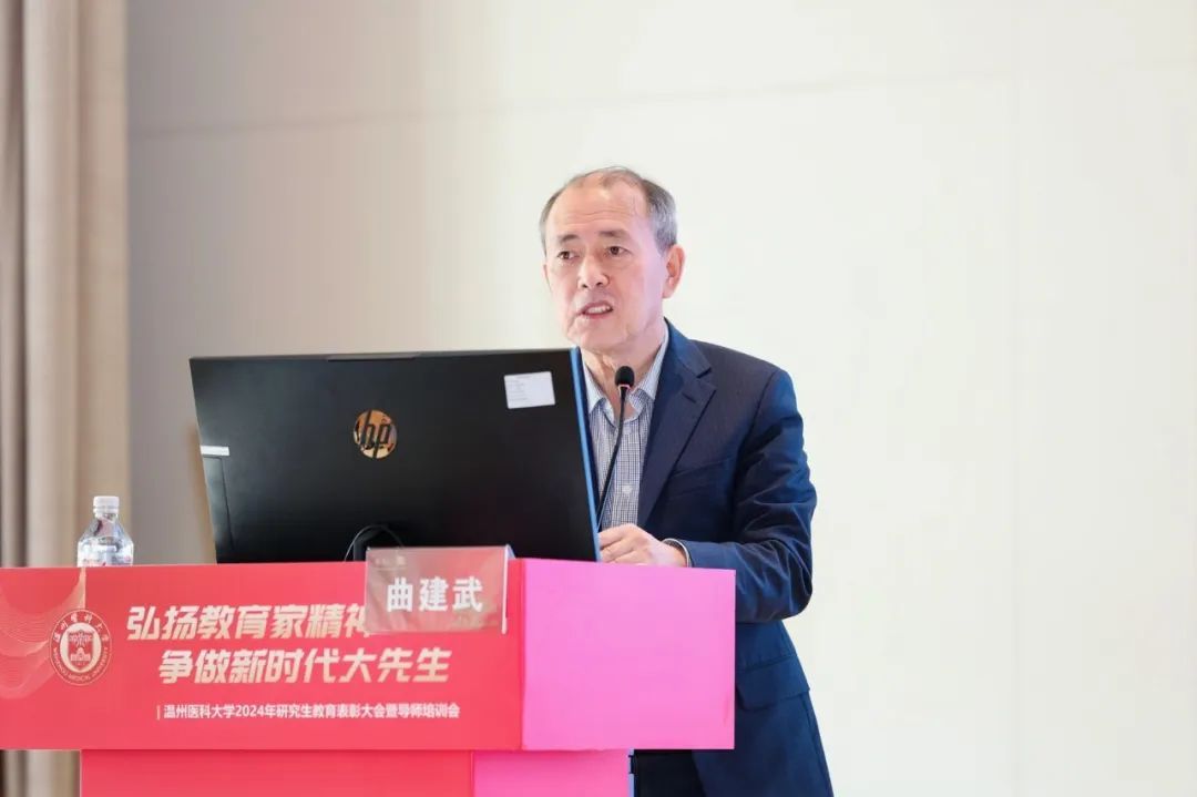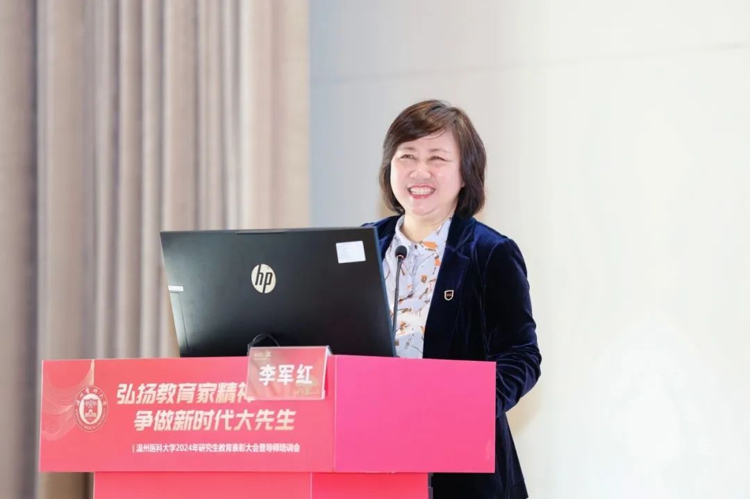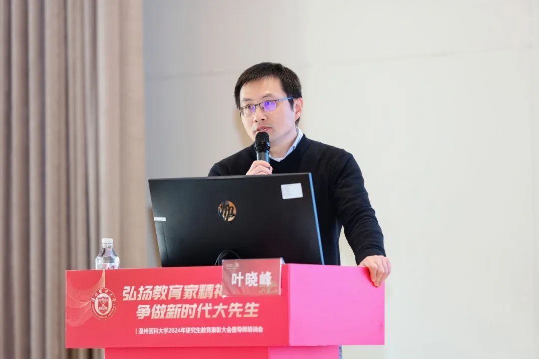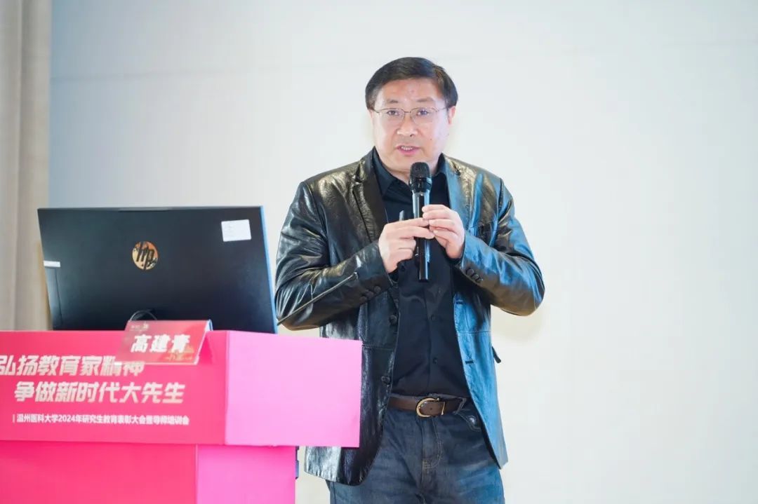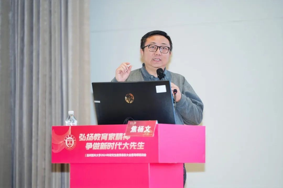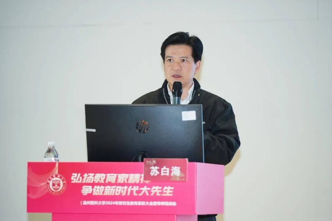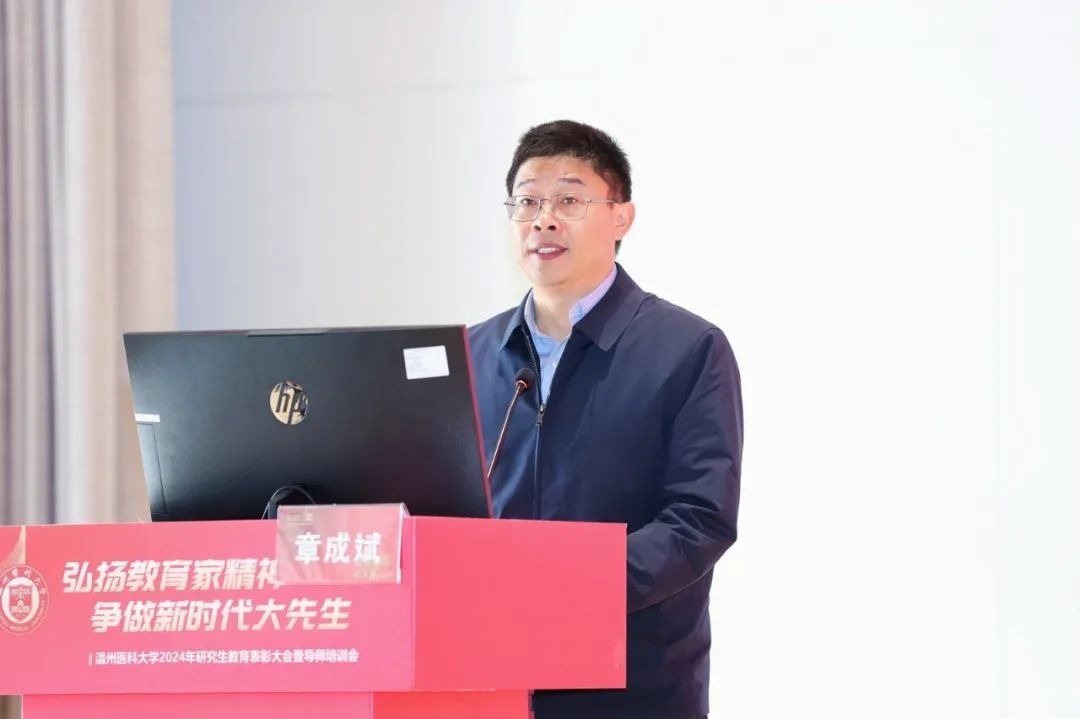 校党委副书记章成斌在讲话中充分肯定了2024年我校研究生教育取得的成绩。他指出,提升教师队伍育人能力,是有效落实立德树人根本任务的前提和基础,也是实现高层次人才培养目标的有效载体和重要抓手。他强调,要落实立德树人,弘扬教育家精神。以教育家精神为引领,努力做精于“传道授业解惑”的“经师”和“人师”的统一者,真正成为一名引领研究生成长成才的指路明灯、学术表率和良师益友。要提升教书育人能力,提高人才培养质量。争做表率,强化引领,努力探索科学前沿,积极践行学术规范,引导学生把学习奋斗的具体目标同民族复兴的伟大目标结合起来,把人生抱负落实到脚踏实地的实际行动中来。要营造和谐导学氛围,构建导学发展共同体。做到严爱相济,关注学生学业科研及生活、心理状况,整合校内外育人资源,寻找人才培养质量、安全稳定以及心理健康之间的平衡点,共同推动我校研究生培养质量再上一个新台阶,为我校“双一流”创建和高水平医科大学建设做出新的更大的贡献!