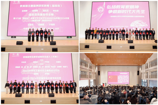 副校长金胜威等领导为教育部主题案例获奖教师、省级优秀学位论文指导教师、校级教学成果奖等研究生教育改革先进个人,以及省级研究生联合培养单位、校级研究生教育满意度先进单位等颁奖,并为新导师颁发聘任证书。博士生导师代表赵斐带领全体教师庄严宣誓。