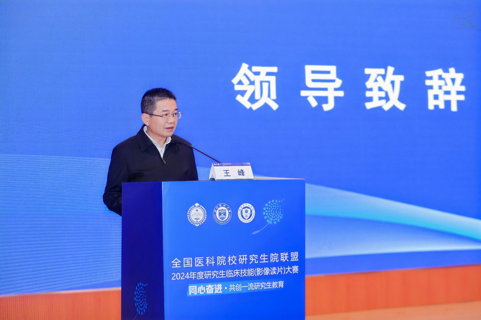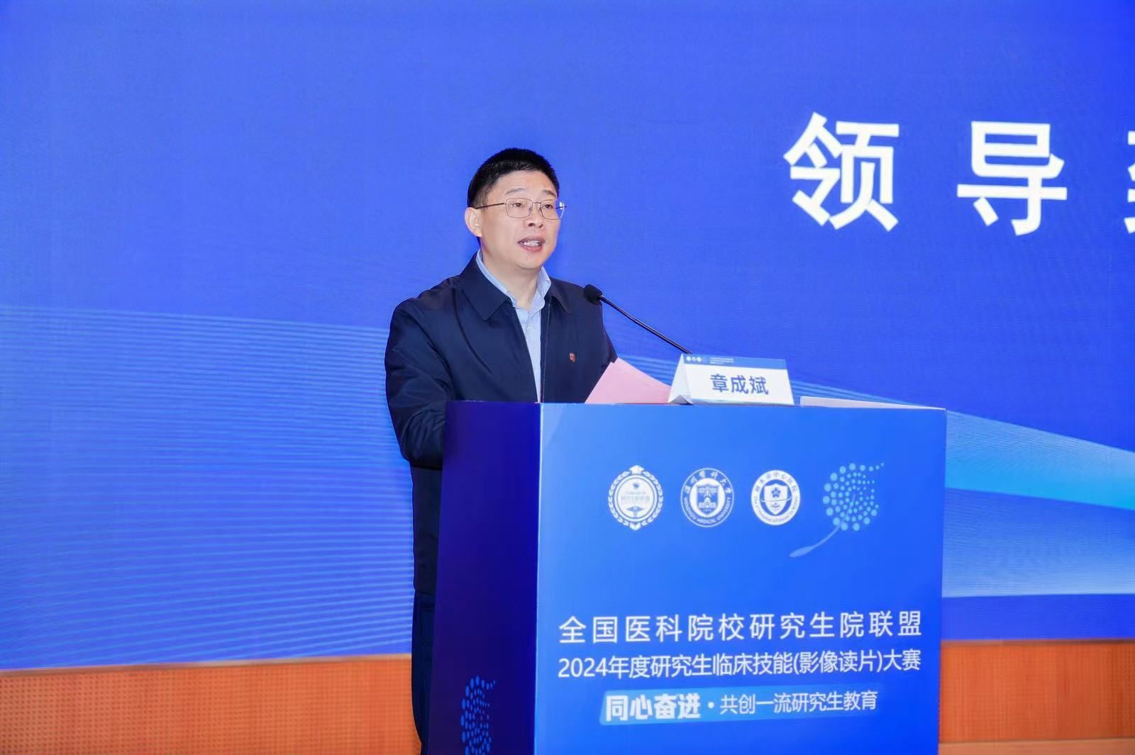章成斌代表鉴黄师 向前来参加比赛的领导、老师以及选手们表示热烈的欢迎,希望能够借助本次比赛,加强全国各医学高校间的交流,共同研讨和探索全面提升专业学位研究生培养质量的新模式、新机制,以更加开放的姿态、更加创新的思维,共同推动医学研究生教育的蓬勃发展,主动回应“健康中国”战略的需求和新时代人民群众对医学教育的期待。希望同学们全力以赴,享受过程,在比赛中展现风采,在交流中增进友谊,互相取长补短,砥砺创新思维,精进创新能力。