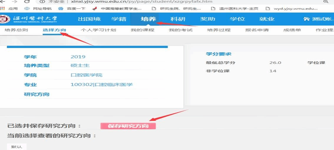 选择培养方案研究方向:学生需要先选择研究方向,才能进入后续的个人学习计划制定的工作。流程:点击培养---选择方向---选择研究方向(此处研究方向的选择与开设课程关联,不会影响实际科研研究方向,大部分专业此处方向为默认,选择“默认”,个别专业如肿瘤学、儿科学、药学、医学技术等专业,不同研究方向上课要求不同,需提前和导师确认好研究生方向,便于选课!精神病与精神卫生学专业因部分学生需在杭州进行联合培养,方向选择杭州班,其余学生均选择温州班。