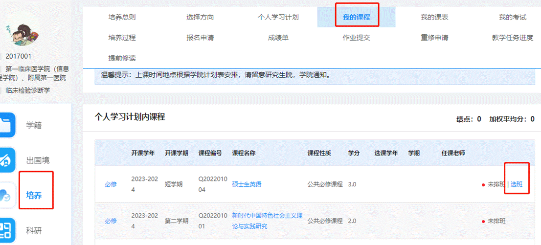 2.操作步骤:点击培养--我的课程,针对开课学年为“2024-2025学年第一学期”的课程,点击“选班”!