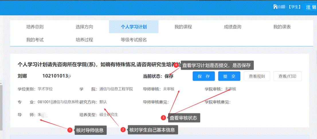 导师审核步骤:登录系统后,点击“培养”-“学习计划管理”,查看学生选择的课程,符合要求的,通过审核。
