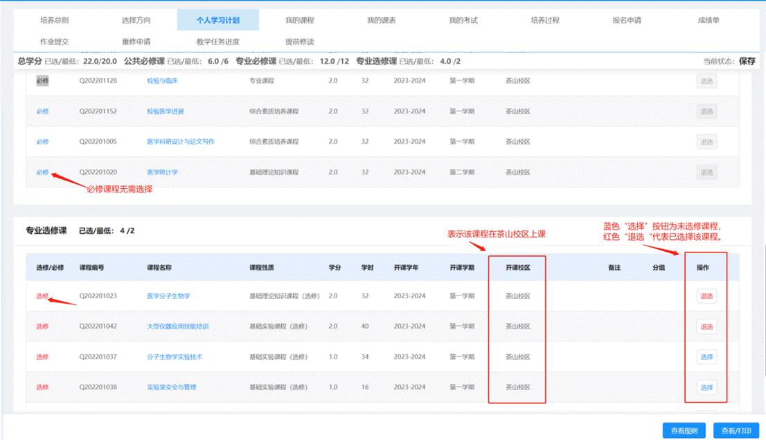 (2)根据培养方案,并事先征询导师后,选择自己后续要学习的课程(课程为必修的,则系统自动选上且无法进行退选的操作,若课程为选修,则学生根据培养方案进行实际操作。)此处可以查看课程上课学年学期,开课校区等信息。每门课程都有相应的开课学年学期,同学们务必认真查看,避免错过!!