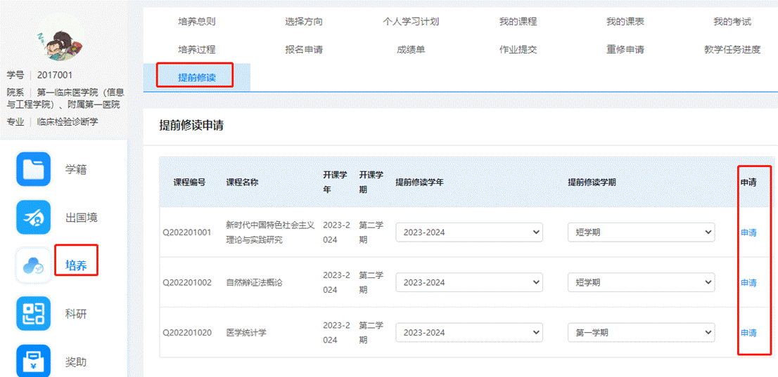 2.申请课程:培养方案中《新时代中国特色社会主义理论与实践研究》(Q202201001)、《自然辩证法概论》(Q202201002)、《医学统计学》(Q202201020)这三门课程是安排在第二学期开课的,可以申请提前修读。